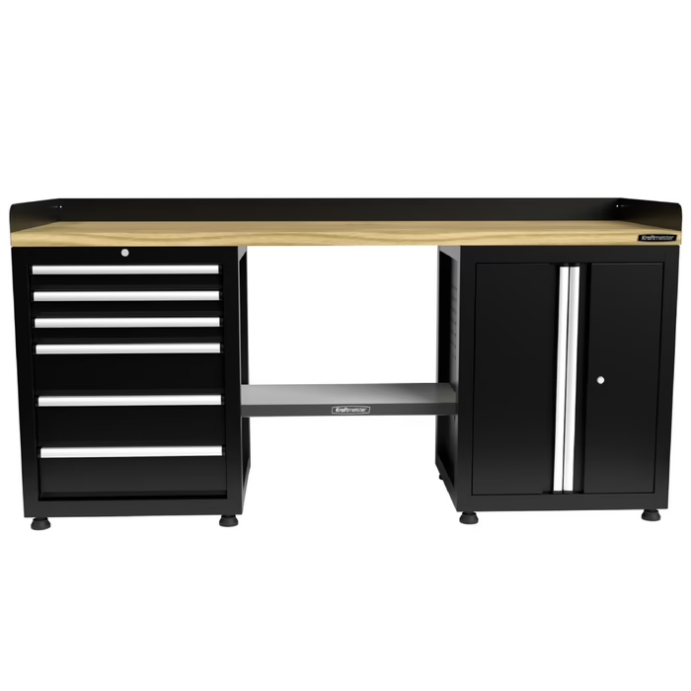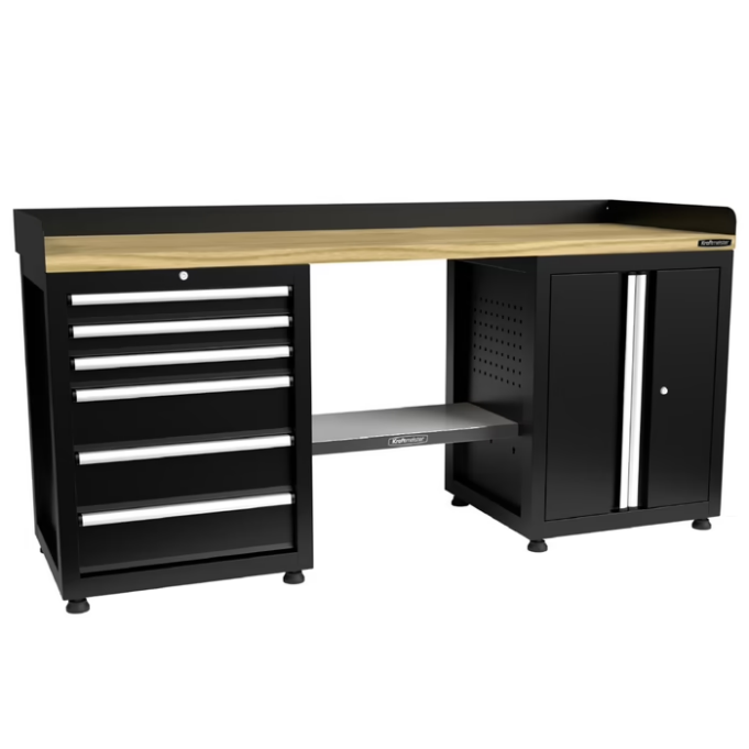 تم تصميم هذه الطاولة لتقديم أداء احترافي يجمع بين القوة، التنظيم، والتشطيب الفاخر. يوفر سطح العمل الواسع المصنوع من خشب البلوط متانة وموثوقية لإتمام المهام الثقيلة، بينما توفر الستة أدراج والبابين مساحة تخزين واسعة ومنظمة للأدوات والمعدات. تجعل متانتها العالية وتصميمها الاحترافي باللون الأسود هذه الطاولة مثالية للورش، الكراجات، والبيئات الصناعية التي تتطلب متانة، كفاءة، ومظهر راقٍ.